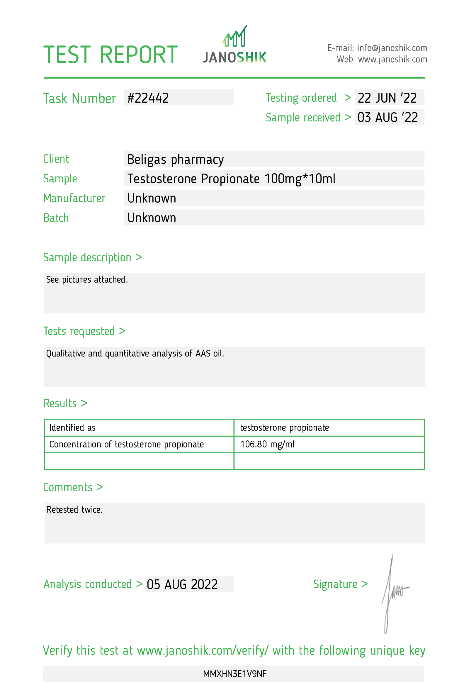 Male bodybuilders often take 400-1200 mg of Propha-Testosterone 100mg/ml each week for 8-20 weeks, depending on their goals. 50-100 mg per week usually works for women.